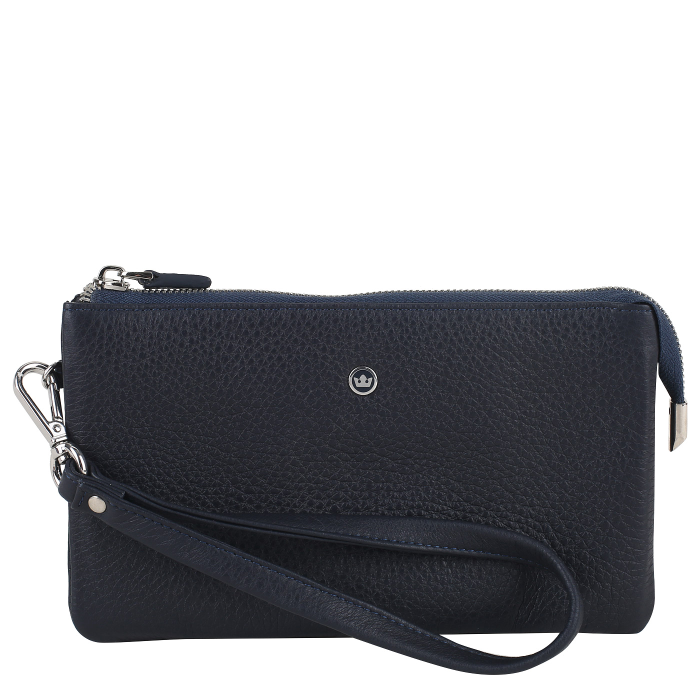 Вместительный клатч на молнии без труда заменит портмоне и визитницу. Аксессуар из темно-синей натуральной кожи состоит из двух отделений — в одном удобно хранить мелочь и купюры, во втором пластиковые карточки и визитки. В комплекте идет ремешок для запястья, который при необходимости можно отстегнуть. На задней стенке клатча расположен внешний карман на молнии.